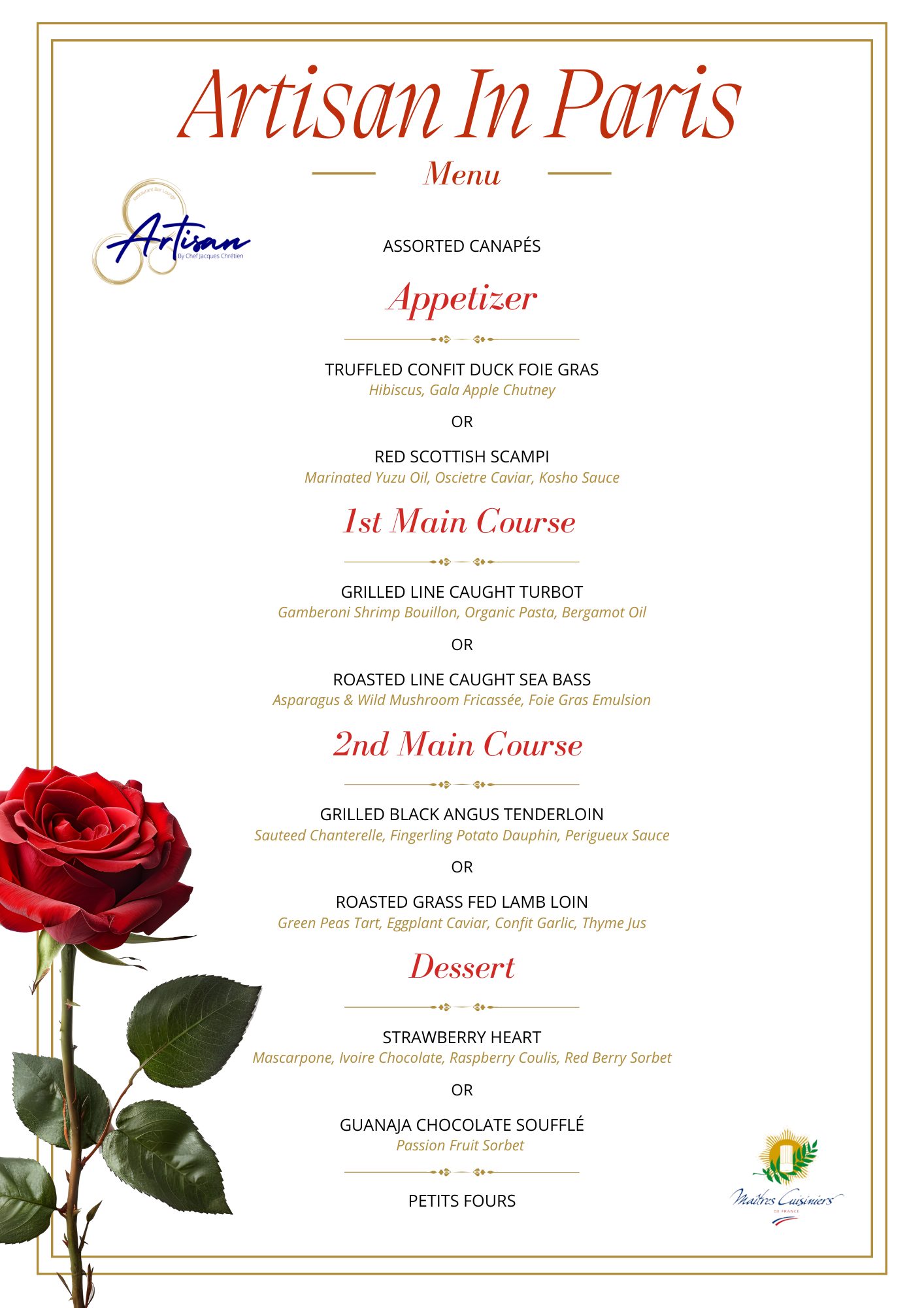 Inspired by the art of French love, this evening is designed as a refined celebration of togetherness. A five-course menu crafted with precision, a rose offered as a symbol, a welcome drink to begin the night, and live entertainment to set the rhythm.